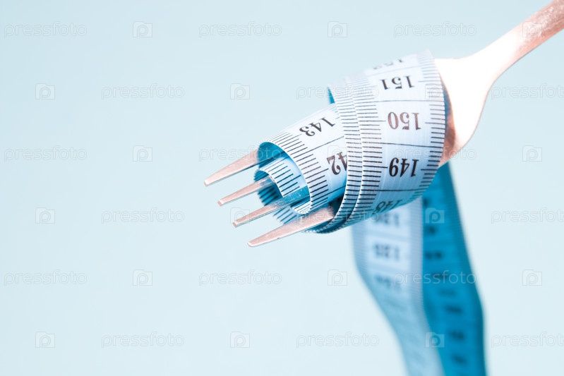 Синяя измерительная лента на вилке, как паста на синем фоне концепция диеты голодание потеря веса и потеря веса