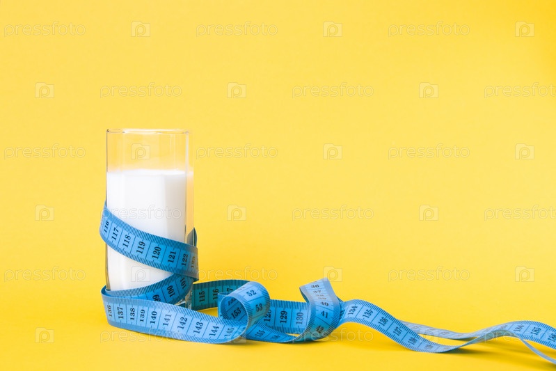 Стакан молока и синяя измерительная лента на желтом фоне, пространство для копирования, концепция диеты и молочных продуктов, правильное питание, белок коровьего молока, лактозное молоко
