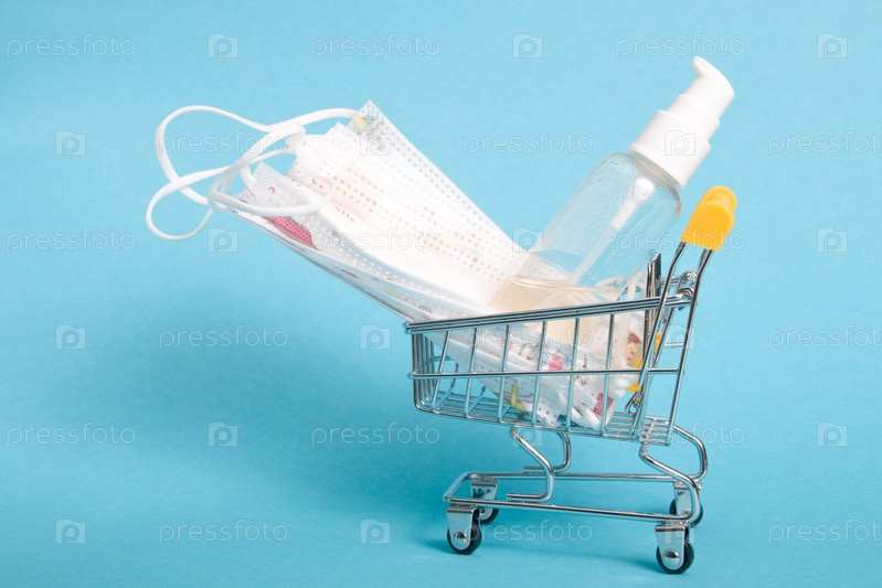 Защитные медицинские маски для лица и дезинфицирующий гель в небольшой тележке для покупок, синий фон, пространство для копирования
