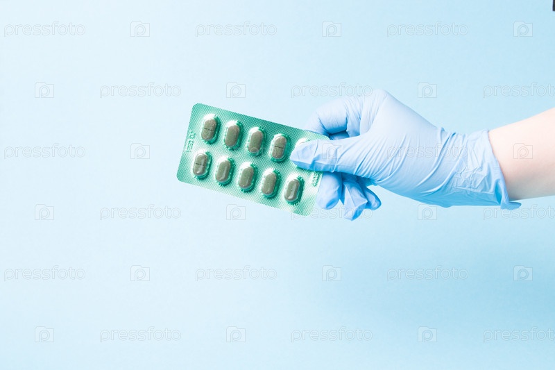 Рука в синей одноразовой медицинской перчатке держит волдырь с зелеными капсулами на синем фоне