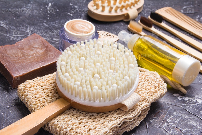 Натуральные средства по уходу за телом и массажная щетка, на темном фоне, экологически чистый образ жизни