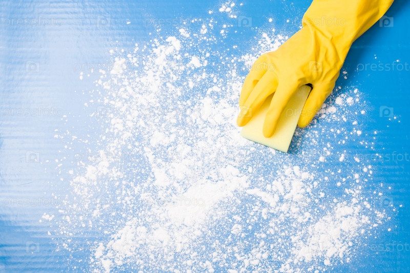 Женская рука в желтой резиновой перчатке моет синюю поверхность от грязи паралоновой губкой