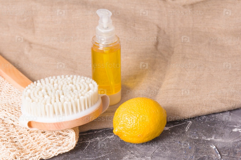 Лимон, деревянная массажная щетка, масло для тела, натуральный уход за кожей дома, натуральное белье на заднем плане