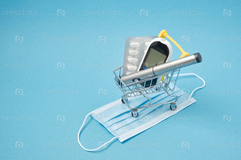 Концепция диабета. Диабетические принадлежности в магазинной тележке на синем фоне