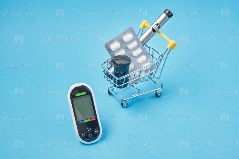 Концепция диабета. Диабетические принадлежности в магазинной тележке на синем фоне