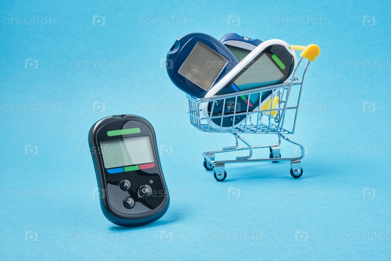 Концепция диабета. Диабетические принадлежности в магазинной тележке на синем фоне