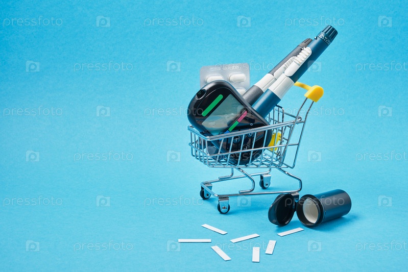 Концепция диабета. Диабетические принадлежности в магазинной тележке на синем фоне