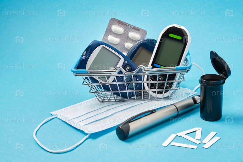 Маска, несколько разных глюкометров в корзине для покупок на синем фоне, таблетки, тест-полоски и инсулиновая шприц-ручка для пациентов с диабетом, концепция аптеки