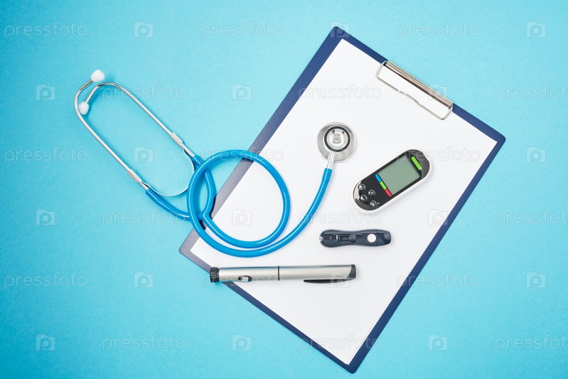 Буфер обмена с белыми чистыми листами бумаги, стетоскоп, глюкометр, ланцет и шприц-ручка с инсулином на синем фоне, концепция дня дайбета, диагностика диабета