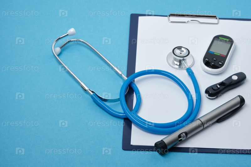 Буфер обмена с белыми чистыми листами бумаги, стетоскоп, глюкометр, ланцет и шприц-ручка с инсулином на синем фоне, концепция дня дайбета, диагностика диабета