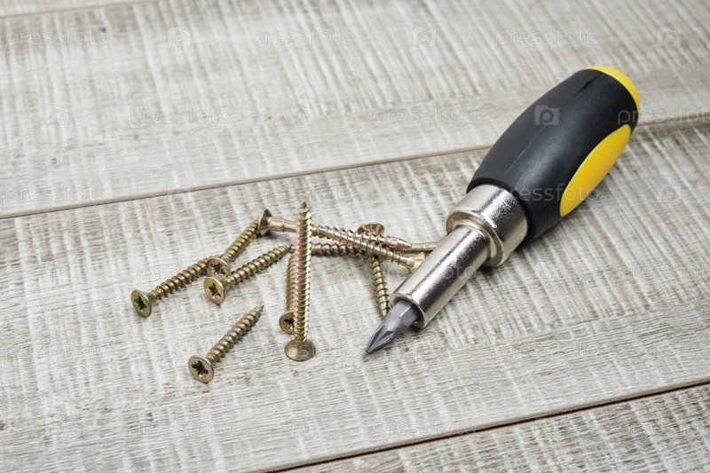 Винты для металла и отвертка со сменными насадками на деревянном фоне