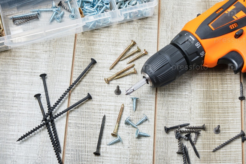 Электрическая отвертка, саморезы, ящик для инструментов на деревянном фоне