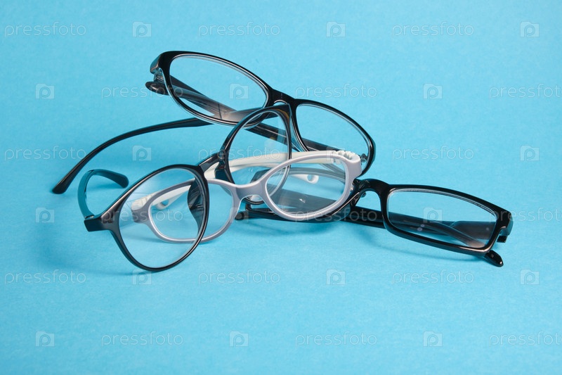 Несколько разных очков на синем фоне, очки для детей и взрослых, место для копирования