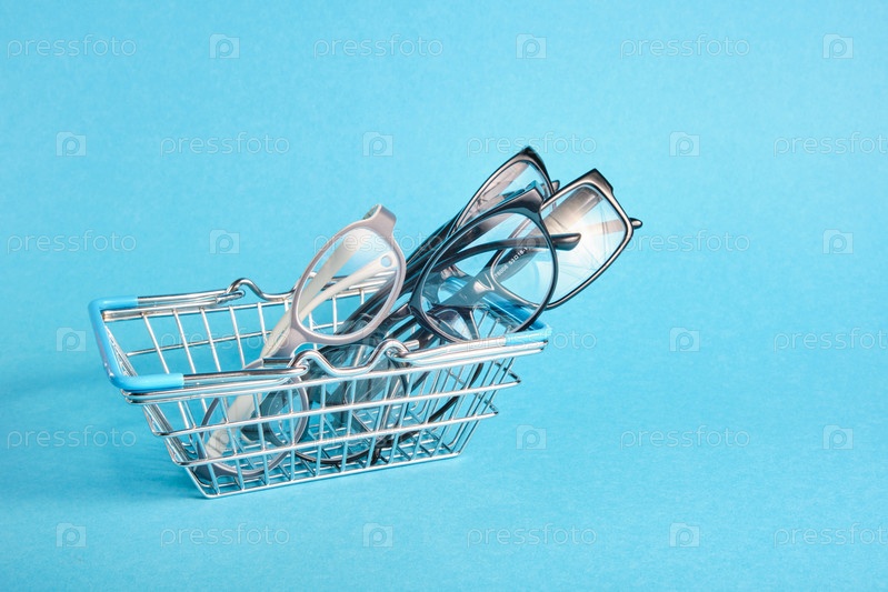 Несколько разных очков в мини-корзине для покупок на синем фоне, очки для детей и взрослых, место для копирования, концепция покупки очков