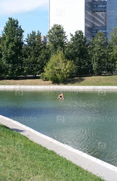 Пруд в городском парке в сухой солнечный летний день