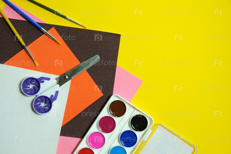 Концепция обратно в школу, кисть, акварельные краски, ножницы и бархатная цветная бумага на желтом фоне, пространство для копирования, вид сверху