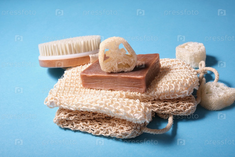 Предметы повседневной гигиены. Синий фон. Природные косметические средства фоном с видом сверху и копией пространства. Flatlay и нулевой отход