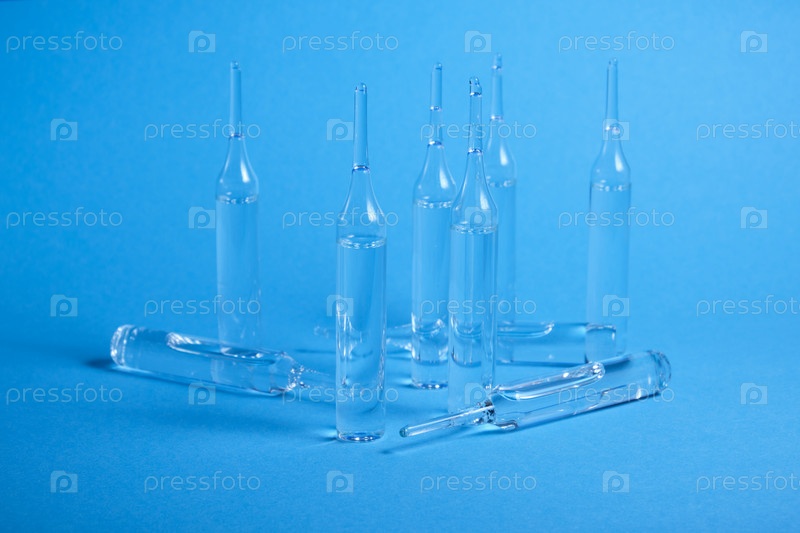 Стеклянные ампулы крупным планом. Медицинские ампулы. Медицинские ампулы на синем фоне