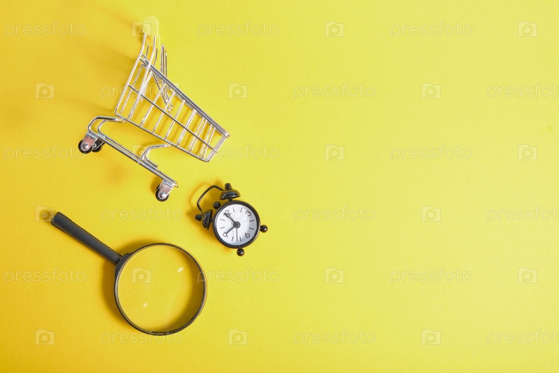 Лупа, будильник и миниатюрная корзина для покупок на желтом фоне, вид сверху, копия пространства