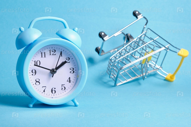Будильник и миниатюрная тележка для покупок на синем фоне