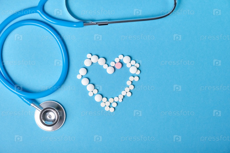 Стетоскоп и сердце от таблеток на синем фоне, концепция кардиологии