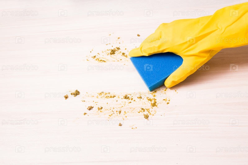 Рука в резиновой перчатке вытирает губкой грязный стол