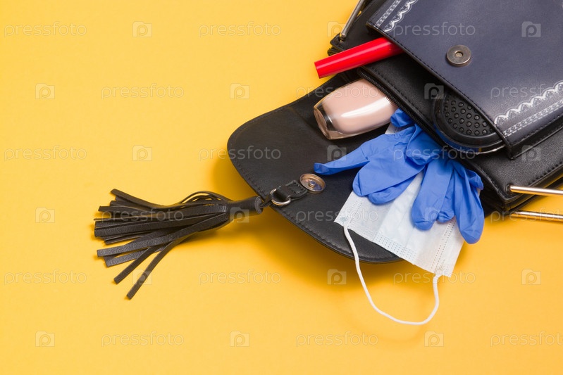 Женская сумка с косметической маской и синими резиновыми перчатками на желтом фоне, пространство для копирования