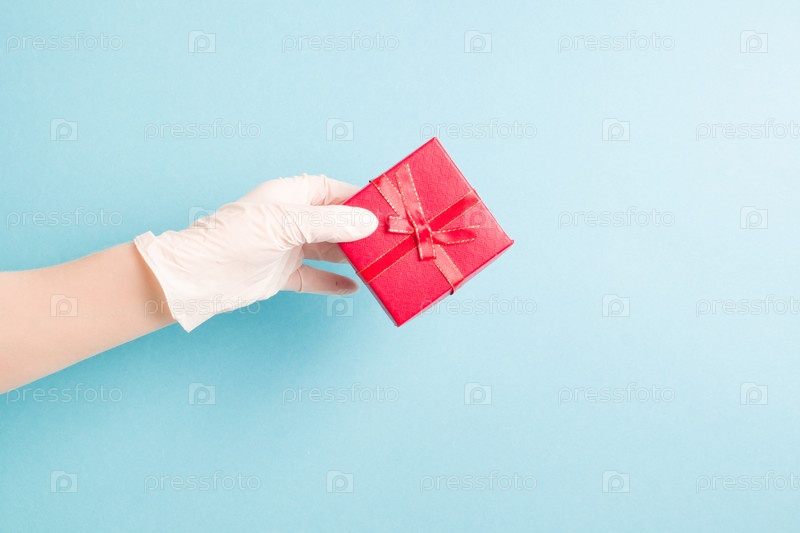 Рука в синей одноразовой перчатке держит красный свет подарочной коробки, синий фон, пространство для копирования