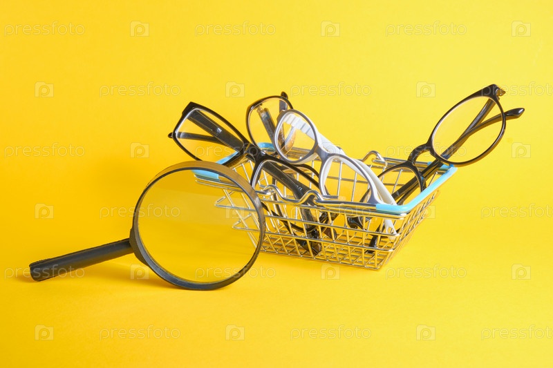 Лупа и несколько разных очков в мини-корзине на желтом фоне