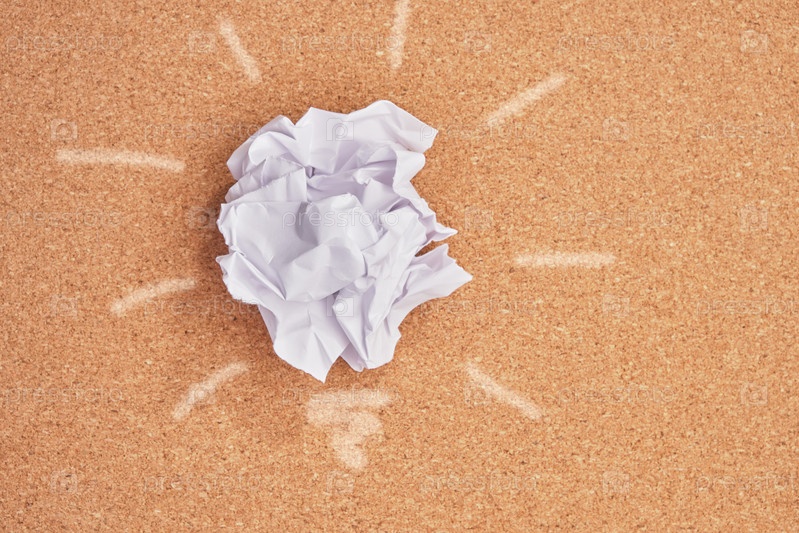 Мятая бумага в форме лампочки на фоне пробковой доски, концепция загрязнения планеты