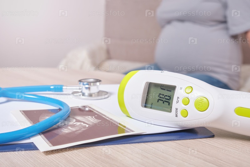 Ультразвуковое изображение, стетоскоп и бесконтактный термометр, беременная женщина на заднем плане