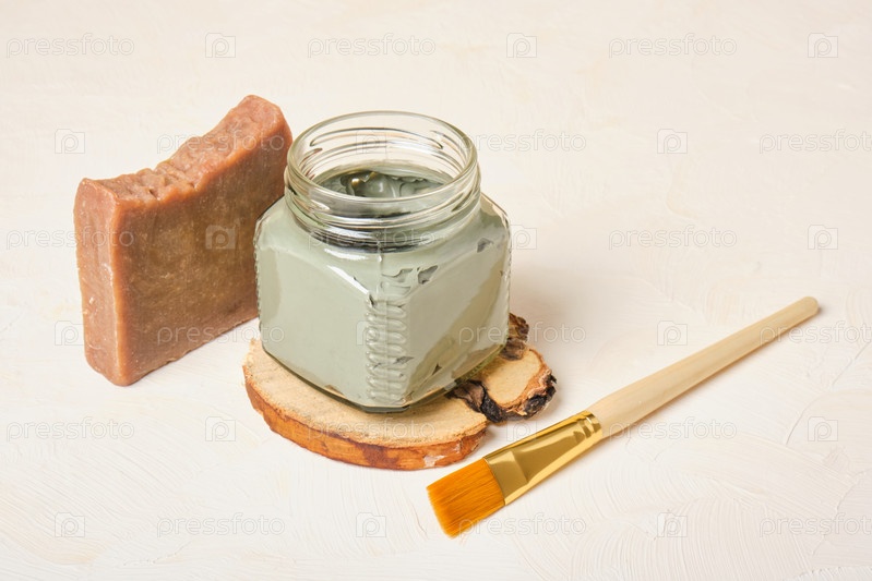 Домашнее какао-мыло, стеклянная банка с косметической глиной и кисть для нанесения, бежевый фон