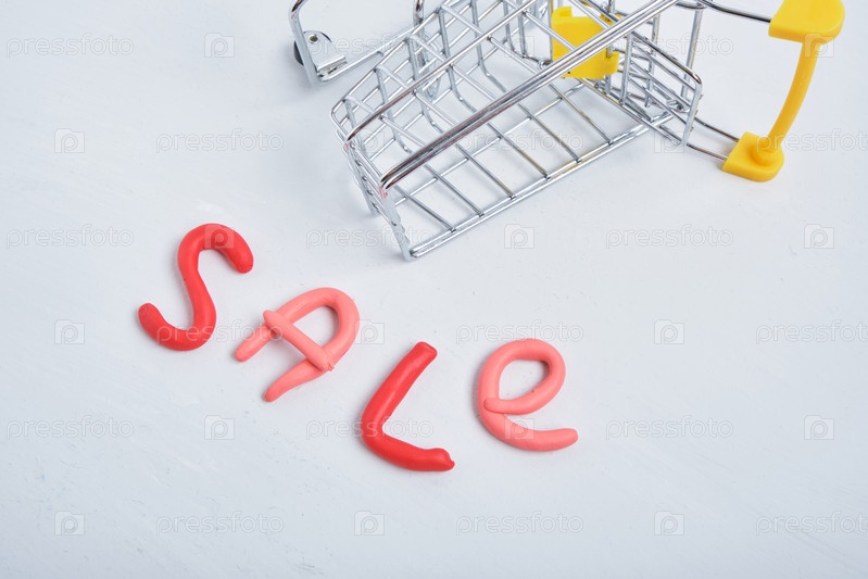 Надпись распродажа и тележка для покупок на сером фоне