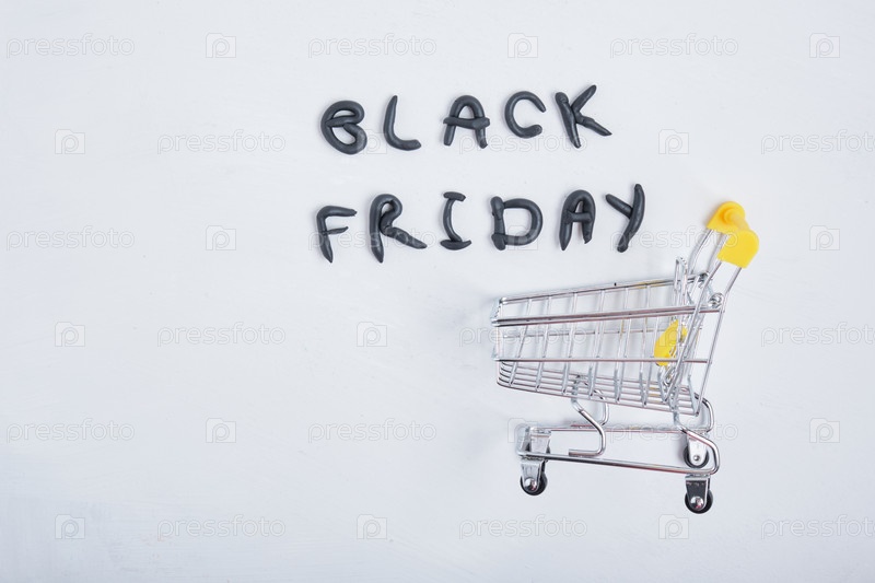 Надпись черная пятница из пластилина и мини-тележка для покупок на сером фоне