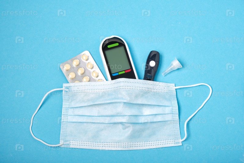 Черный глюкометр, ланцет, блистерные таблетки и маска для лица на синем фоне,