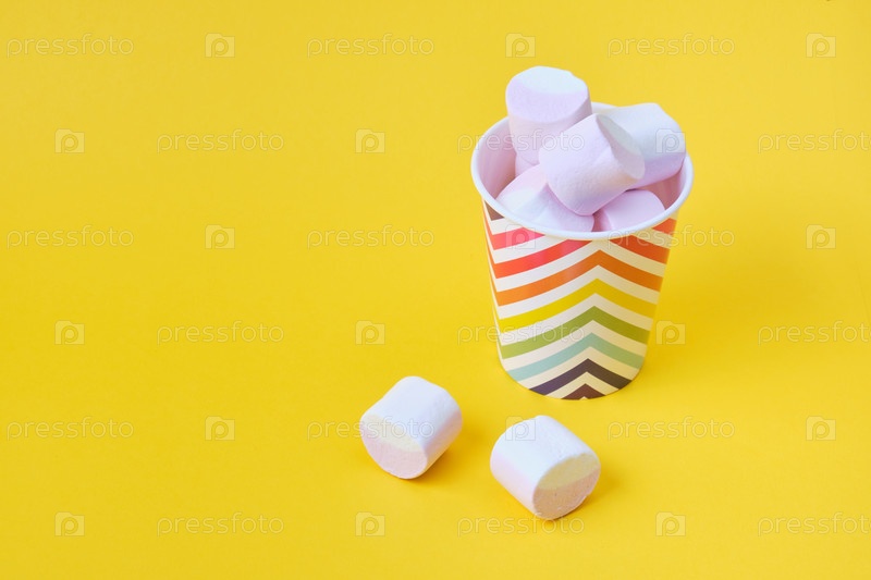 Зефир с фруктовым соком в праздничном бумажном стаканчике с ярким геометрическим узором на желтом фоне, пространство для копирования