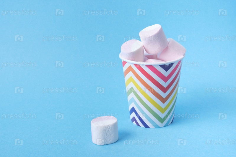 Зефир с фруктовым соком в праздничном бумажном стаканчике с ярким геометрическим узором на синем фоне, пространство для копирования