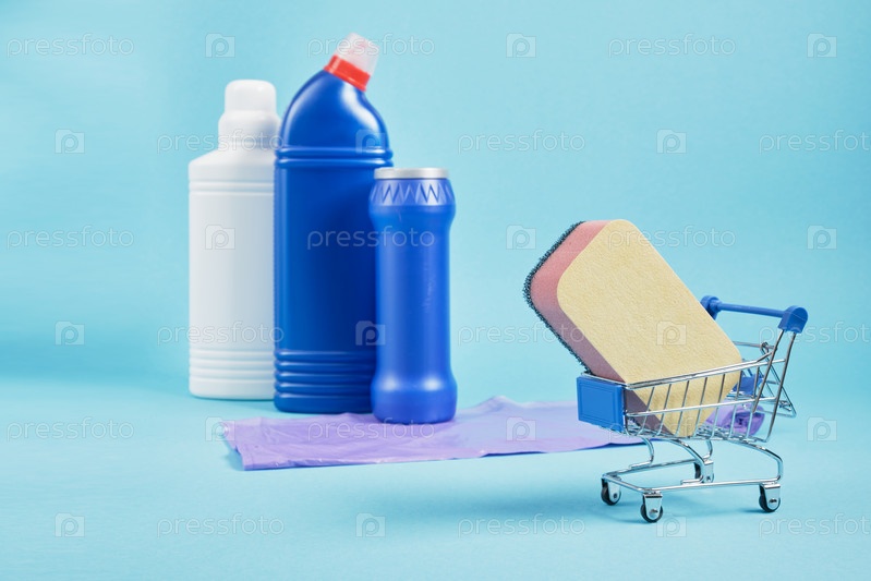 Губка на тележке для покупок и чистящий набор на заднем плане