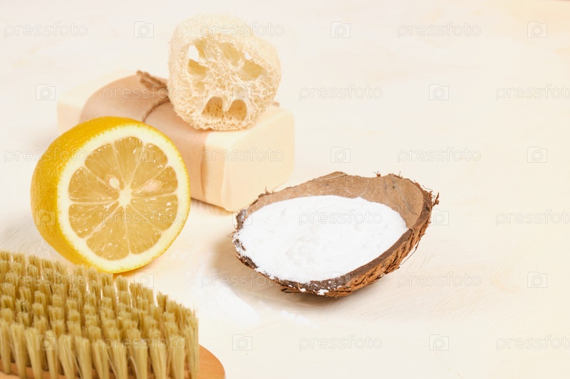 Деревянная щетка, лимон, мыло, люффа и пищевая сода для экологической очистки безотходной концепции образа жизни