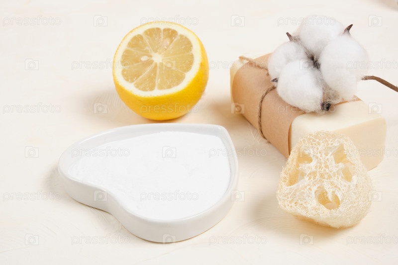 Лимон, люффа, мыло и пищевая сода для домашнего хозяйства
