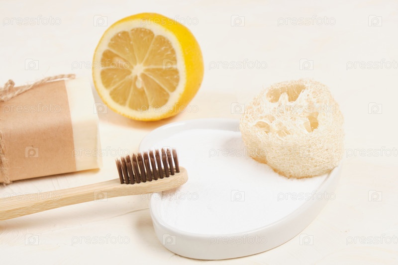 Бамбуковая зубная щетка и сода на светлом фоне