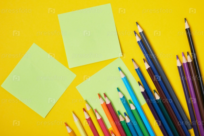 Цветные карандаши и заметки на желтом фоне копией пространства