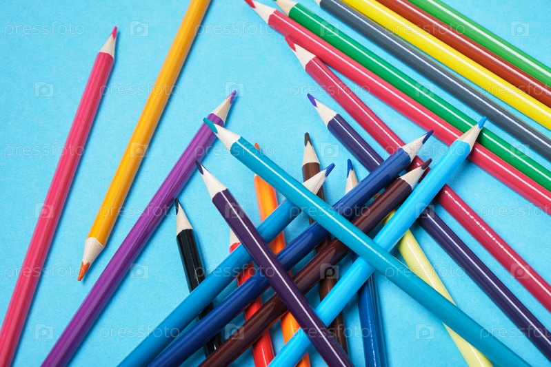 Цветные карандаши на синем фоне вид сверху