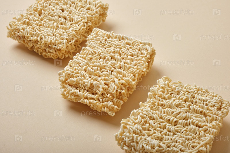 Сушеная лапша быстрого приготовления на бежевом фоне. крупный план