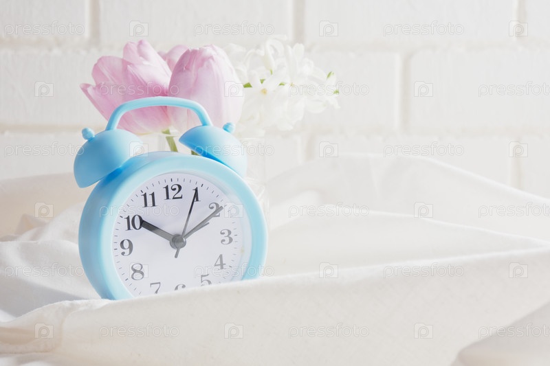 Синий будильник, цветы на кровати, концепция весеннего утреннего настроения