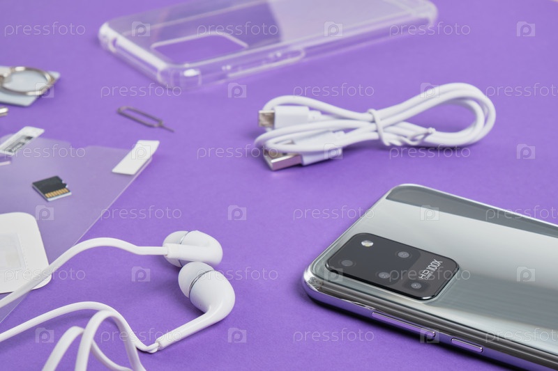 Аксессуары для смартфона на фиолетовом фоне, смартфон, наушники, зарядное устройство и аксессуары для защиты телефона от царапин и падений