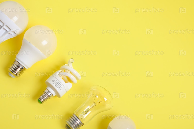 Несколько разных лампочек на желтом фоне, пространство для копирования, цвет тренда