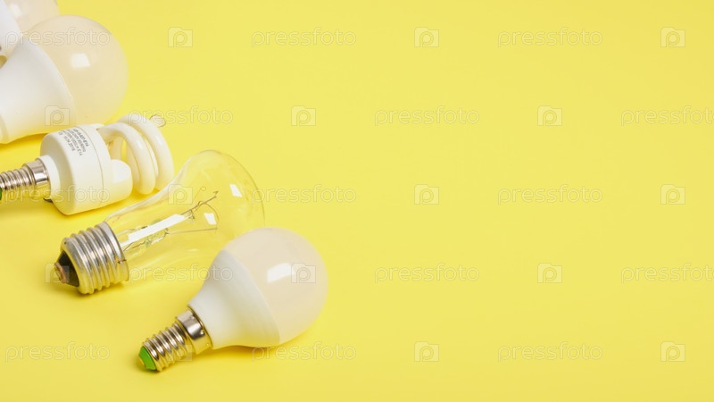 Несколько разных лампочек на желтом фоне, пространство для копирования, цвет тренда
