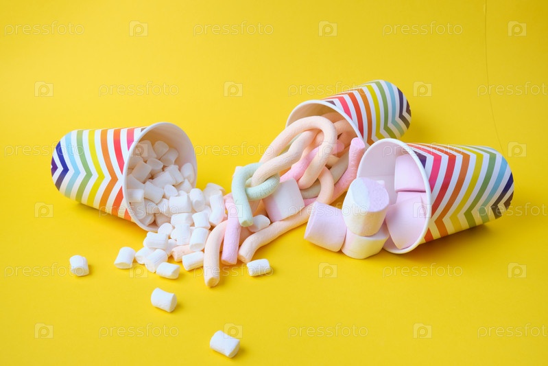 Различные виды зефира выпадают из праздничных бумажных стаканчиков с геометрическим узором на желтом фоне, пространство для копирования