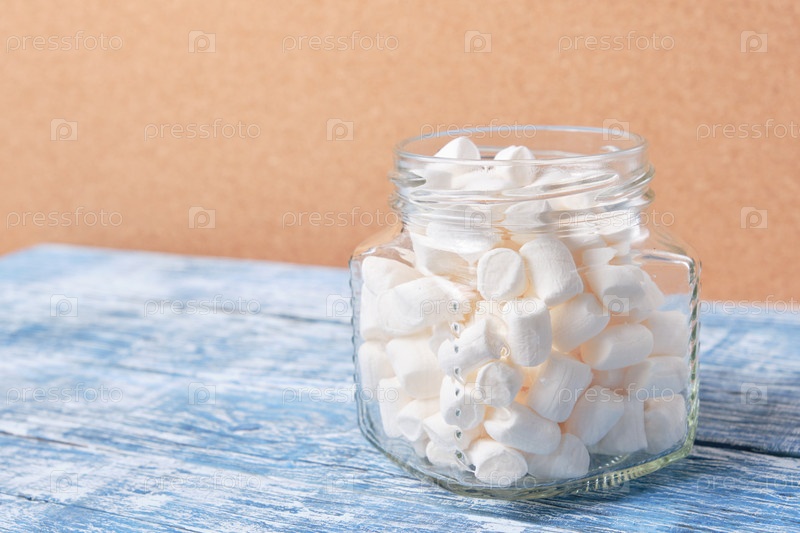 Маленькие белые зефирки для украшения и напитков и украшения тортов в банке на деревянном синем фоне